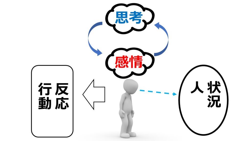 このように、、人は状況を見て、頭で考え(思考)、感情が湧いてくるという事を一瞬で行っているのですが、重要なのは思考によって感情が変わってくるということ。そして感情はその後の行動に影響を及ぼすという事なのです。